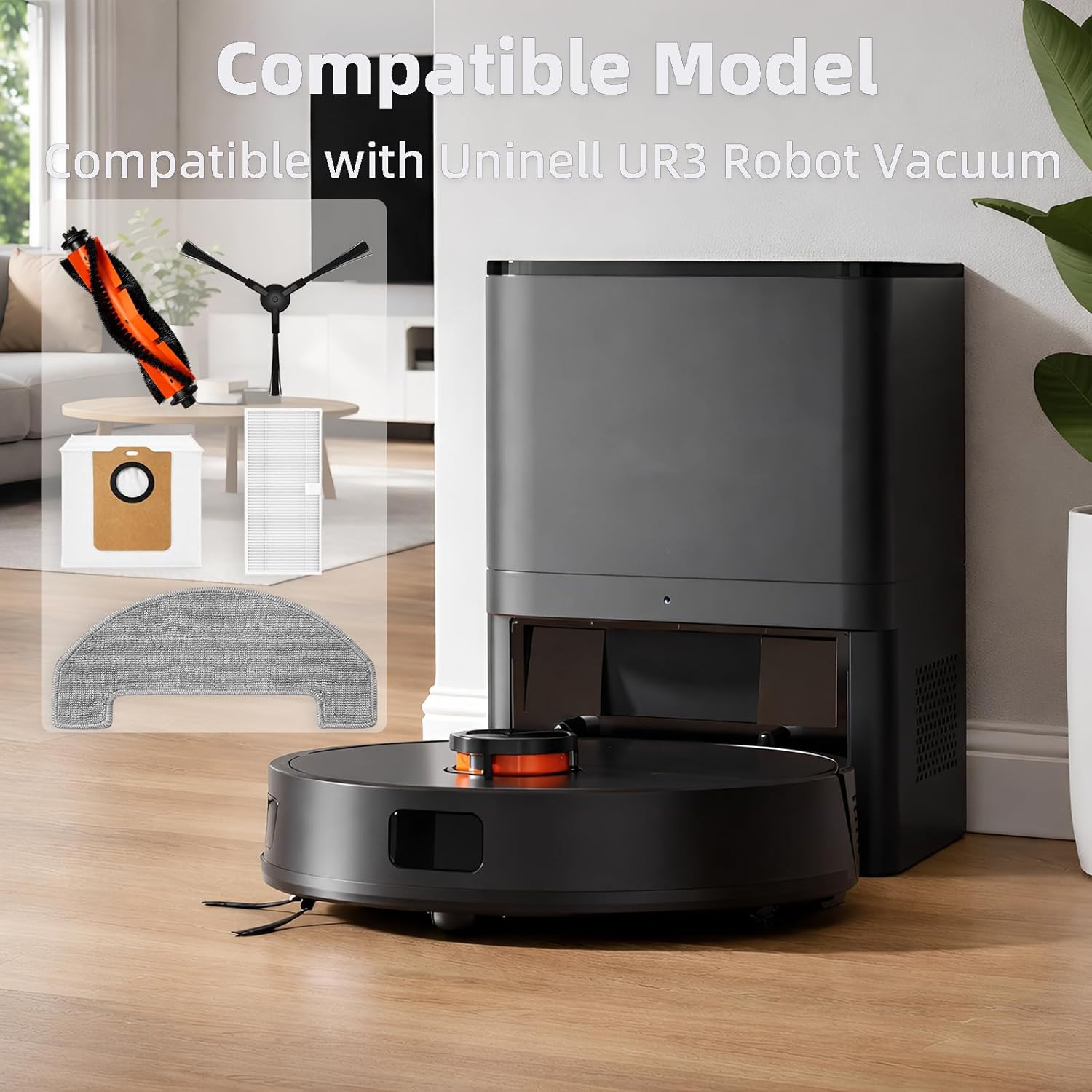 ✅ Compatible with Uninell UR3 📦 Package includes: 1 x Main Roller Brush 6 x Dust Bags 6 x Side Brushes 4 x Hepa Filters 4 x Mop Pads 😺 Tips: If the side brushes are bent or curled from shipping, please soak them in warm water for a few minutes to recover. It will not affect the quality or performance.