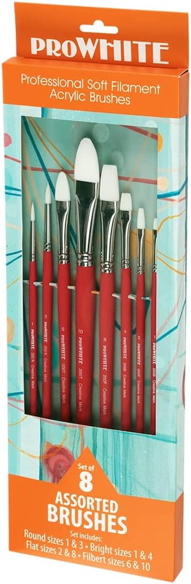 Introducing the Creative Mark Pro White Soft White Filament Hair Paint Brush, a must-have addition to your art supplies. Pro White Professional Acrylic Brushes and Sets are created from a remarkably fine, soft white filament hair. This synthetic hair holds color wonderfully, bristles shape beautifully, and delivers an excellent brush response. This artist paint brush is ideal for a range of techniques, including acrylic painting, glazing, caseins, acrylic gouache, and water-mixable oils. Each brush in the paint brush sets for artists features nickel-plated seamless ferrules, firmly attached to long double red-lacquered wood handles. These characteristics ensure durability, longevity, and a comfortable grip while painting. A key feature of this set is the excellent brush response it offers, allowing for graceful movement and precision. With the ability to hold a significant amount of color, these brushes for acrylic painting provide lots of control, leading to more accurate and detailed work. The sizing of these paint brushes acrylic is similar to bristle hair brushes, where 12 equals 1 inch wide. The Creative Mark Pro White Acrylic Paint Brushes come in a variety of sizes in Flat, Bright, Round, and Filbert. This mix of shapes and sizes makes it a highly versatile option for any artist. The Creative Mark Pro White Soft White Filament Hair Acrylic Paint Brush and Brush Sets is a solid choice for anyone in need of a comprehensive paintbrush set for acrylic paint. With its impressive features and diverse range of brush sizes and shapes, it offers an excellent option for those who paint with brushes and are serious about their craft. Whether you're a student, beginner, professional, or artist, this set is designed to support your creativity and help you produce your best work. Set of 8 Includes Round sizes 1 & 3, Bright sizes 1 & 4, Flat sizes 2 & 8, and Filbert sizes 6 & 8