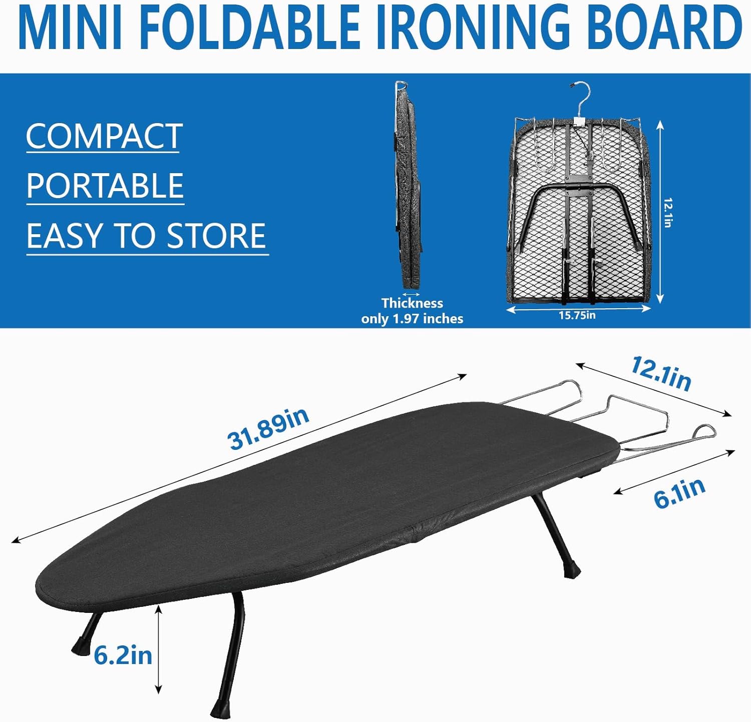The Space-Saving Marvel: Your Ultimate Compact & Portable Tabletop Ironing Board Tired of wrestling with a bulky, traditional ironing board that dominates your precious closet space, gathers dust in the corner, or simply doesn’t fit into your modern lifestyle? Do you live in a cozy apartment, a bustling dorm room, a compact city studio, or an adventure-ready RV where every square foot counts? Perhaps you travel frequently and miss the convenience of crisp, wrinkle-free clothes on the go? If the hassle of storing and setting up a full-sized ironing monster feels outdated and impractical, meet the solution engineered for your reality: The Ultra-Compact Foldable Tabletop Ironing Board with Integrated Iron Rest. This isn’t just another small ironing board; it’s a meticulously designed space-saving powerhouse that brings professional-grade ironing efficiency right to your kitchen table, desk, countertop, or even your bed. We understand that life happens in smaller spaces and on the move, and your laundry routine shouldn’t be a burden. Our tabletop ironing board is the culmination of smart engineering, durable materials, and thoughtful features, all packed into an incredibly portable form factor. It’s the liberation you’ve been waiting for from the tyranny of cumbersome laundry gear. Unrivaled Compactness & Revolutionary Portability: Where Big Performance Comes in a Tiny Packages The core genius of this ironing board lies in its transformative design. When you’re ready for wrinkle-free perfection, it unfolds in seconds to a perfectly functional work surface measuring 31 inches long by 11 inches wide by 6 inches high. This generous tabletop size provides ample room to smoothly iron shirts, blouses, pants legs, dresses, kids’ clothes, linens, napkins, and a wide array of garments with ease. But the real magic happens when you’re done. With a simple, dampened-action folding mechanism (no pinched fingers!), it collapses down to an astoundingly slim profile of just under 2 inches thick (approx. 5 cm). Imagine an ironing board that disappears! Weighing a mere 3.9 lbs (approx. 1.8 kg), it’s lighter than most laptops. This incredible combination of compact folding and lightweight construction makes it the undisputed champion for: Tiny Homes & Apartments: Reclaim valuable floor and closet space instantly. No more awkward angles or blocked pathways. Dorm Rooms & Student Living: Tuck it under your bed, slide it behind furniture, or stash it in a narrow closet corner. Perfect for keeping your presentation sharp between classes. RV & Camper Van Life: Essential gear for maintaining a polished look on the open road without sacrificing precious storage cubicles. Frequent Travelers: Throw it in your suitcase, trunk, or RV storage without adding bulk or weight. Hotel ironing boards? No more questionable cleanliness or instability! Small Laundry Rooms/Condos: Maximize your limited utility space. Mount it on a wall hook or stand it vertically in a narrow gap. Second Homes & Vacation Rentals: Provide a convenient ironing solution without dedicating permanent space. Engineered for Speed, Efficiency, and Professional Results: Your Heat Management Hub Forget flimsy, low-performance mini boards. Our design prioritizes functionality and professional results: High-Performance Ironing Surface: The foundation is a robust metal mesh panel. This isn’t just any mesh; it’s engineered for optimal heat distribution and dissipation. It allows steam to pass through effortlessly, preventing moisture buildup that can cause damp spots or uneven ironing. This translates to faster wrinkle removal and crisper results on all your fabrics. Protective & Heat-Resistant Layering: Directly covering the sturdy mesh is a thick, quilted cotton padding. This provides the essential cushioning your garments need for flawless ironing, preventing unwanted or impressions from seams underneath. Over this padding sits a removable heat-reflective cotton cover. This critical layer: Provides a smooth, non-stick surface for your iron to glide effortlessly. Reflects heat upwards, concentrating it onto your garment for maximum efficiency. Acts as a vital protective barrier for both your clothes (preventing scorching or shiny marks from direct mesh contact) and the underlying mesh board itself. Enhances overall ventilation thanks to the breathable cotton fabric working in tandem with the mesh below. Integrated Iron Rest: Safety & Convenience Built-In: No more frantic searches for a coaster or trivet! Seamlessly integrated onto one end of the board is a dedicated, heat-resistant iron rest. This is a game-changer for safety and workflow: Provides a stable, designated spot to safely park your hot iron during adjustments or folding. Prevents accidental burns on your table surface or scorching the ironing board cover. Keeps your iron upright and ready, maximizing efficiency during your ironing session. Rock-Solid Stability You Can Trust: Built to Last Where You Use It Stability is non-negotiable when you’re pressing down with a hot iron. We engineered this compact board to feel as secure as its full-sized counterparts:Durable Steel Frame: The entire structure is built around a powder-coated, heavy-duty steel frame. This isn’t flimsy tubing; it’s designed for rigidity and longevity. It provides a firm, unwavering foundation that won’t wobble, flex, or sag under pressure, even when ironing heavier fabrics like denim or canvas. Non-Slip Silicone Foot Caps: Each leg tip is fitted with high-quality silicone caps. These aren’t just bumpers; they are engineered for maximum grip. They create a powerful suction effect on smooth surfaces like wood, laminate, glass, or countertops, ensuring the board stays firmly planted exactly where you place it. No more annoying sliding or dangerous tipping mid-iron! Simple, Safe, and Secure Operation: Designed for Effortless Use Ease of use was paramount in our design: Effortless One-Handed Folding: The 